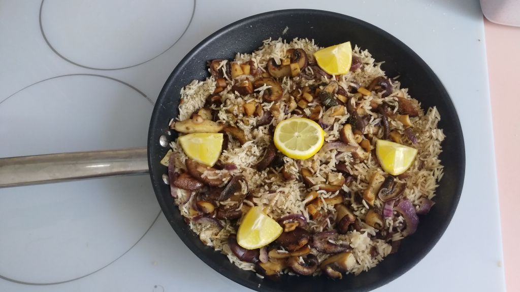 Así que finalmente me decante por una receta india: Un arroz pilaf de setas aromatizado con especias y hierbas. Se trata de un arroz vegetariano, ya que salvo por un poco de mantequilla no hace uso de carne. En mesa aporta mucha presencia y el aroma que desprende este plato es espectacular, siendo en el fondo un plato simple pero muy efectivo.